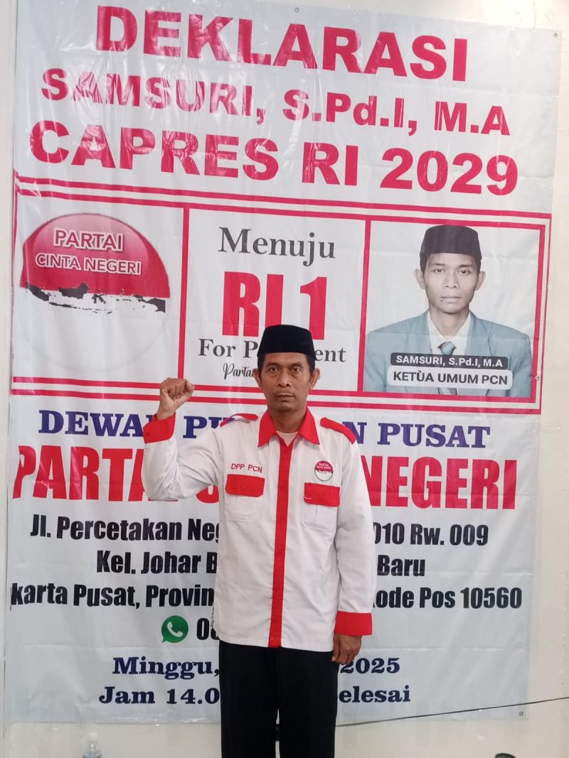 Jakarta, 27 April 2025 — Dewan Pimpinan Pusat Partai Cinta Negeri (DPP PCN) secara resmi menetapkan Ketua Umum Partai Cinta Negeri, Samsuri, S.Pd.I, M.A, sebagai Calon Presiden Republik Indonesia untuk Pemilihan Umum Presiden tahun 2029. Deklarasi tersebut disampaikan dalam sebuah acara resmi yang diselenggarakan pada hari Minggu, 27 April 2025, bertempat di Ruang Pertemuan DPP Partai Cinta Negeri, Jalan Percetakan Negara IV No.1, RT 010 RW 009, Kelurahan Johar Baru, Kecamatan Johar Baru, Jakarta Pusat, dimulai pukul 14.00 WIB hingga selesai.