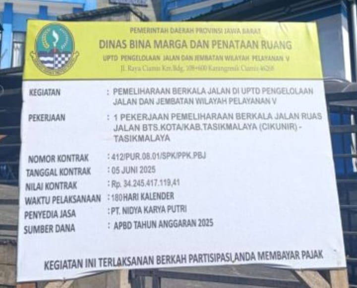 Adapun pekerjaan ini adalah Pemeliharaan Berkala Ruas Jalan Batas Kota/Kabupaten Tasikmalaya (Cikunir) – Tasikmalaya. Proyek dikerjakan oleh PT Nidya Karya Putri dengan nilai kontrak sebesar Rp34.245.417.119,41, dan waktu pelaksanaan ditetapkan selama 180 hari kalender.