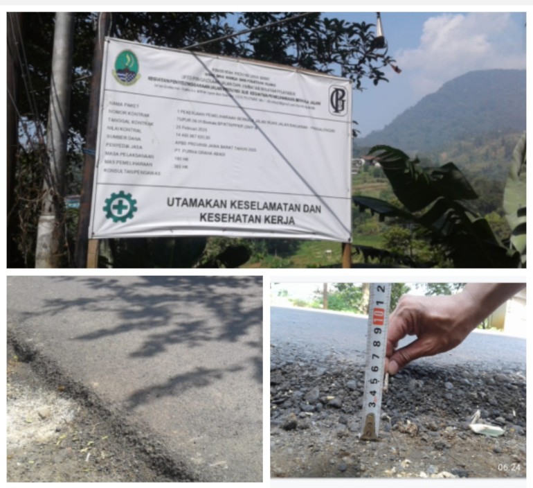 BANDUNG NOW . WEB .ID <>      Bandung – Proyek pemeliharaan berkala jalan pada Ruas Jalan Banjaran–Pangalengan kembali menuai sorotan publik. Pekerjaan dengan nilai kontrak Rp14,49 miliar yang dikerjakan PT Purna Graha Abadi berdasarkan Paket Kontrak No. 75/PUPR.08.01/BM.6.4.2.2/PPK/PJJ/UPT-III/2025 tertanggal 25 Februari 2025, diduga jauh dari standar teknis yang dipersyaratkan.